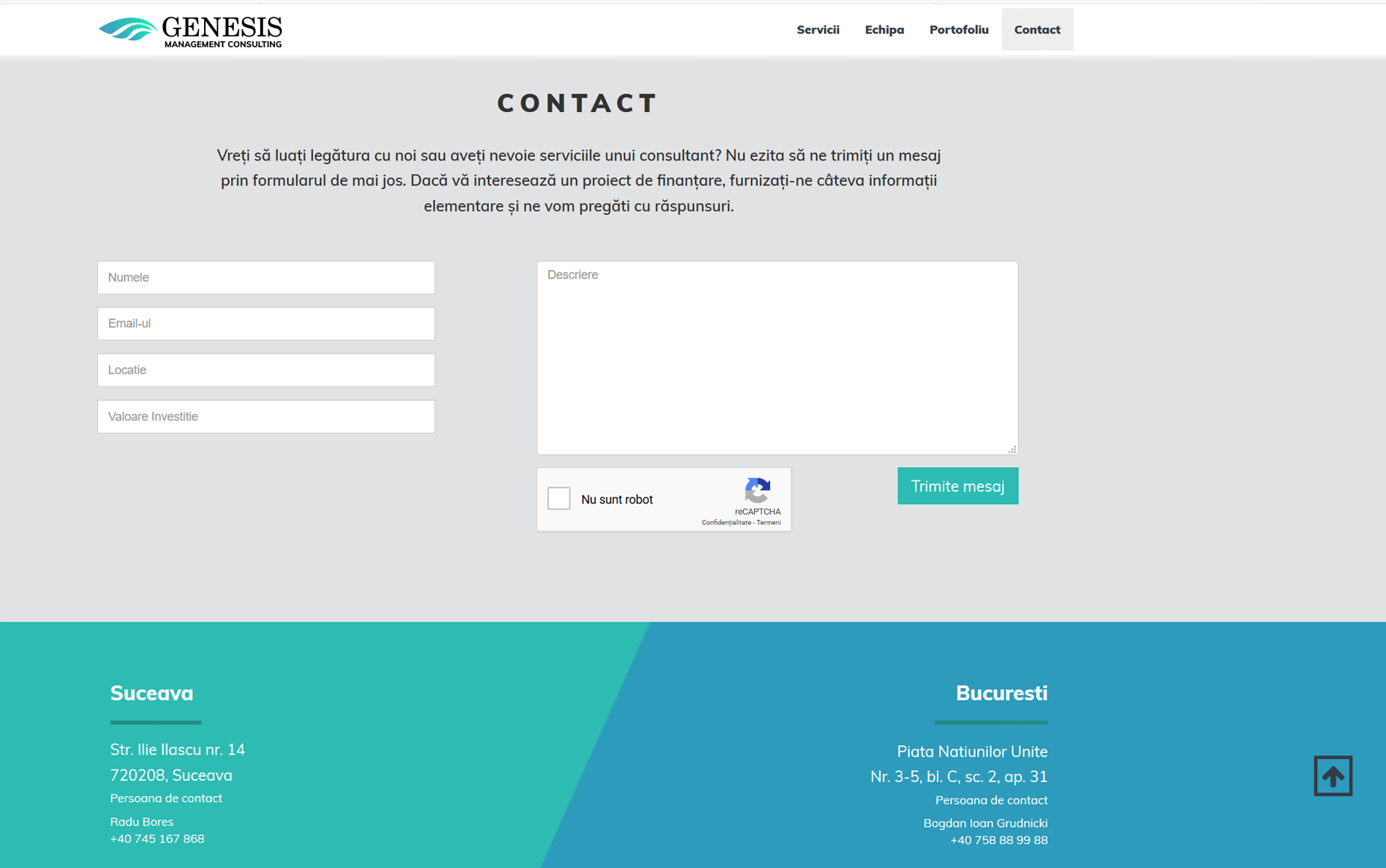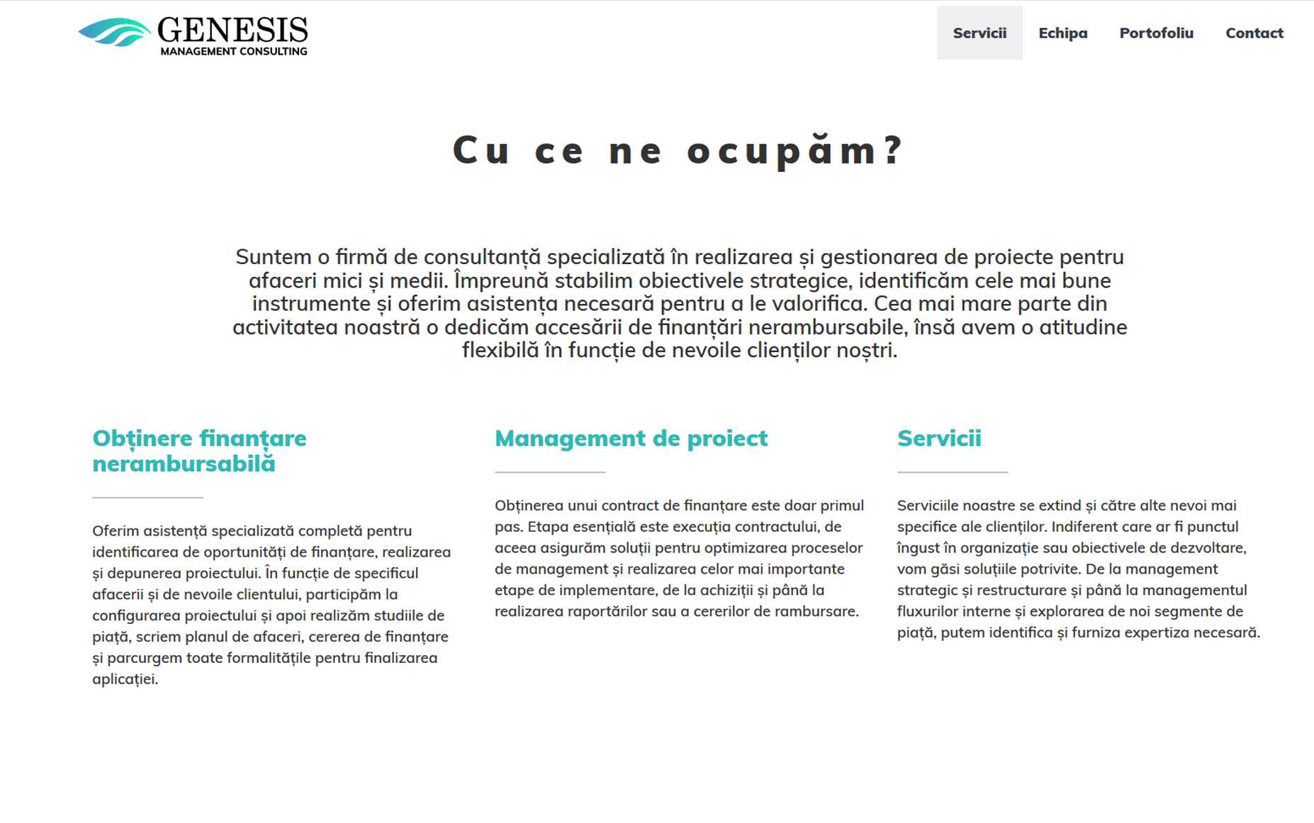 A doua misiune a fost să surprindem esența serviciilor Genesis Management Consulting într-un onepage simplu și elegant. Ca o carte de vizită digitală, pagina prezintă într-un format minimalist și responsive cele mai importante informații despre firmă, echipă și portofoliu.